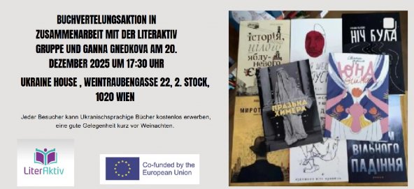in Zusammenarbeit mit der LiterAktiv Gruppe und Ganna Gnedkova am Samstag 20. Dezember, 2025 um 17:30 Uhr. Kommen Sie vorbei um Bücher zu erwerben.