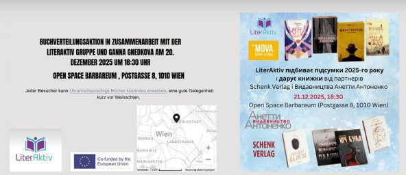 in Zusammenarbeit mit der LiterAktiv Gruppe und Ganna Gnedkova am Sonttag 21. Dezember, 2025 um 18:30 Uhr.,Open Space Barbareum in Wien. Kommen Sie vorbei um Bücher zu erwerben.